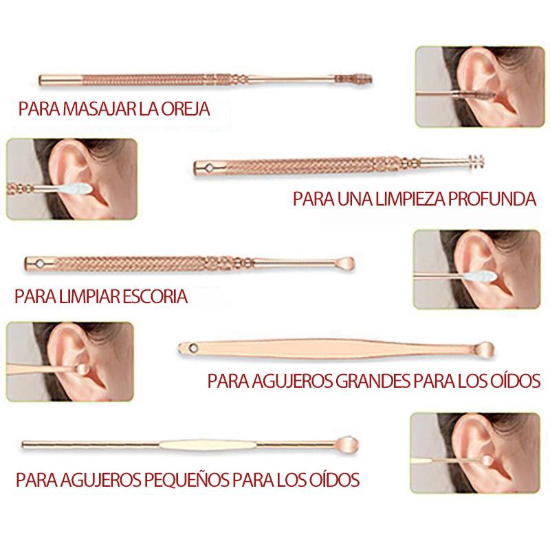 • EFECTO DESTACADO: el cerumen está diseñado en forma de cuchara, que puede eliminar eficazmente el cerumen acumulado, que es más rápido y más limpio que limpiar con un hisopo de algodón. Es una herramienta para limpiar eficazmente la cera del oído.