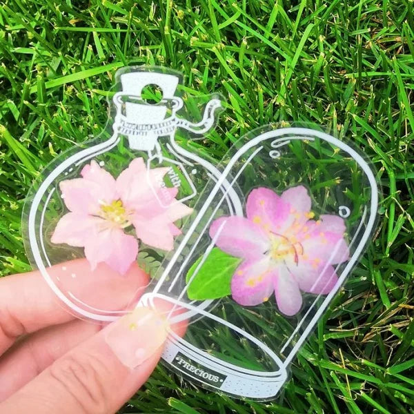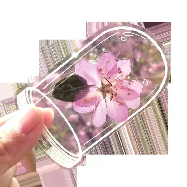 Hermosas flores secas prensadas en marcador transparente, elegantes y vívidas, llenas de un ambiente fresco.
